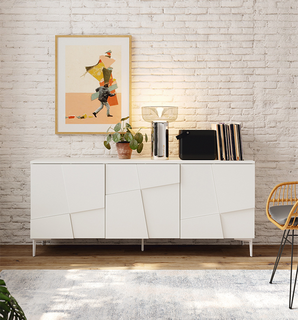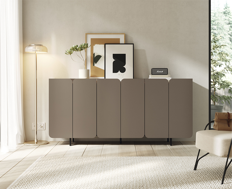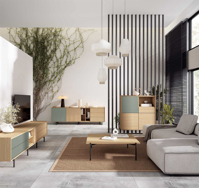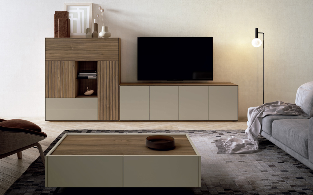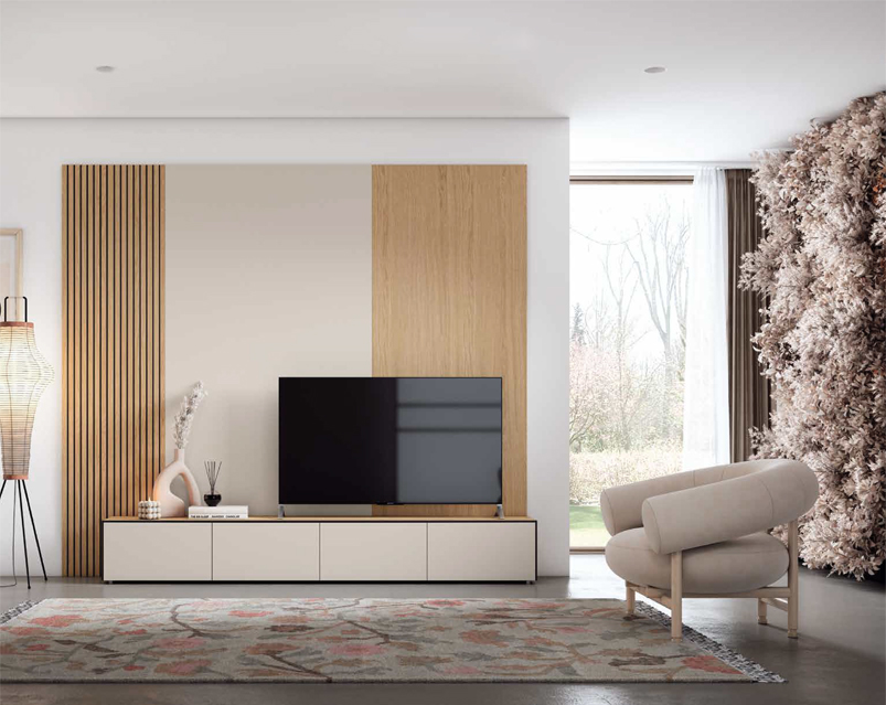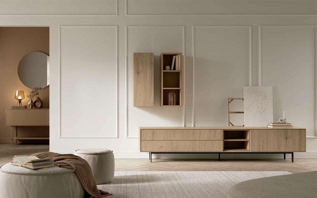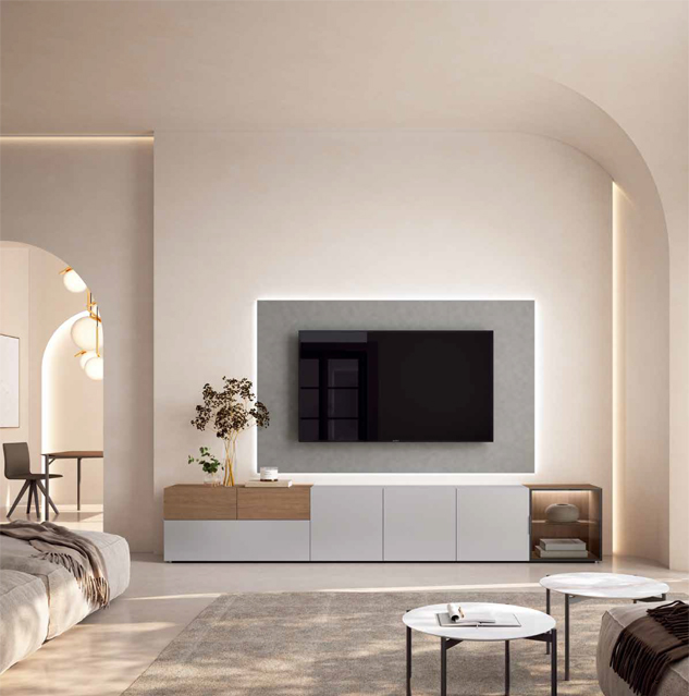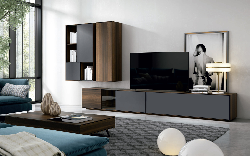Los muebles TV, aparadores, contenedores y librerías pueden ir creciendo mediante la adición de módulos y cajones. Con un ritmo constante que juega con los diversos materiales y texturas. Propuestas que nacen de la búsqueda de materiales nobles: maderas, porcelánicos y lacados. Provocando una reacción emocional de dinamismo y equilibrio, para los que quieren hacer única su vivienda.